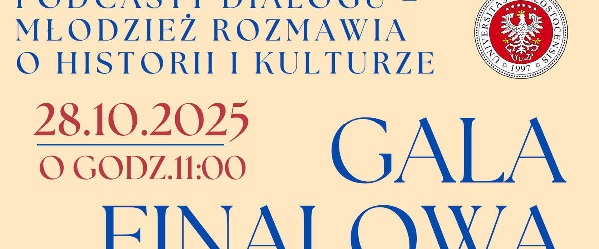 Serdecznie zapraszamy 28 października 2025 r. (wtorek), godz. 11:00 do Uniwersyteckiego Centrum Kultury i Nauki im. Ludwika Zamenhofa, ul. Ciołkowskiego 1N w Białymstoku, na uroczyste podsumowanie projektu „Podcasty Dialogu – Młodzież rozmawia o historii i kulturze”, podczas którego zaprezentowane zostaną efekty pracy młodzieży i ekspertów – edukacyjne podcasty o kulturze, tradycjach i tożsamości narodów Europy Wschodniej: Ukrainy, Białorusi, Mołdawii, Gruzji i Rosji.