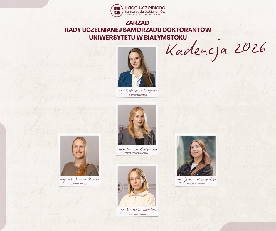 Z dniem 01.01.2026 r. zainaugurowała swoją działalność nowa Rada Uczelniana Samorządu Doktorantów Uniwersytet w Białymstoku.